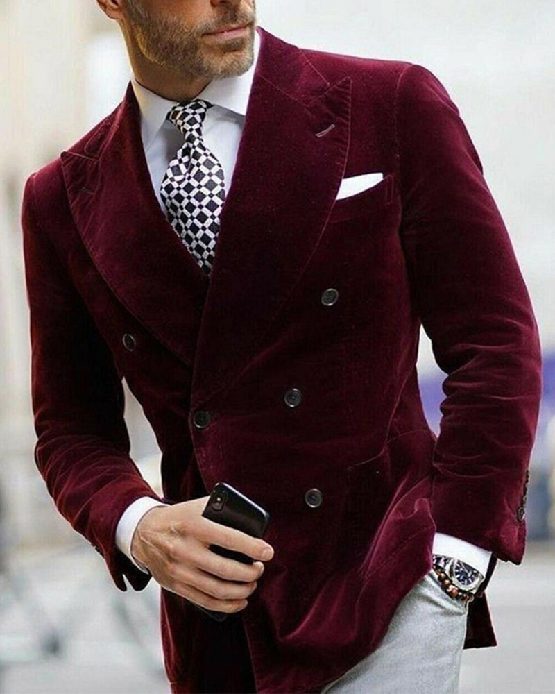 Burgundy Double Breasted Velvet Mens Blazer Elegant Single Coat Smoking Male Suit Dinner Jacket with Big Peaked Lapel Costume