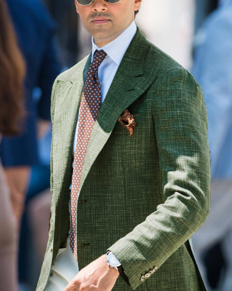 Peak Lapel Casual Suits Lino Tweet Green Blazer Jacket Outfits for Men 2 Pieces(Jacket +Ivory Pants)