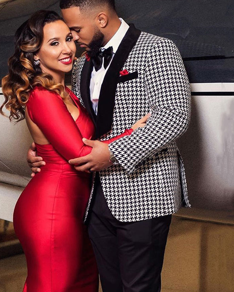 Black Velvet Lapel Houndstooth Tweed Suits Men's Sports Jacket Wedding Suits Blazer 2 Pieces (Jacket +Pants))