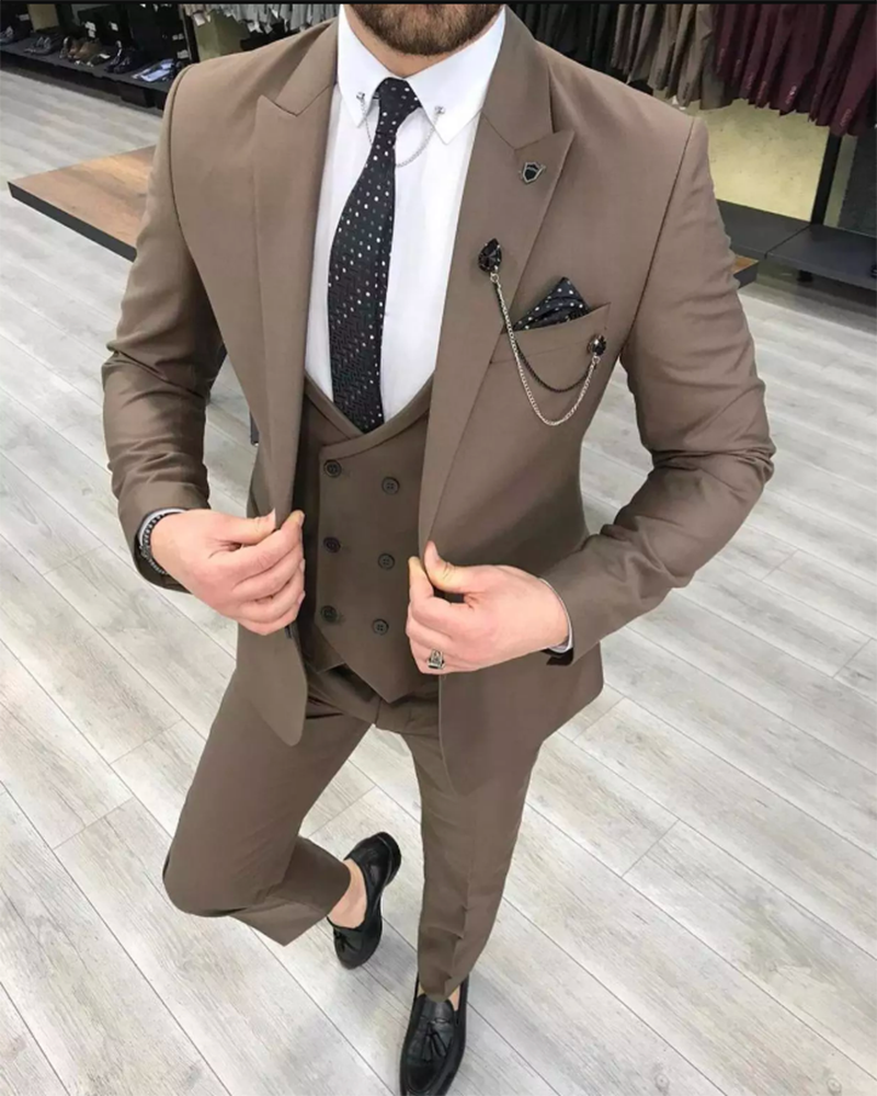 Brown Suits for Men Peak Lapel 3 Pieces Fall Wedding Suits Jacket+Pant +vest CB22981