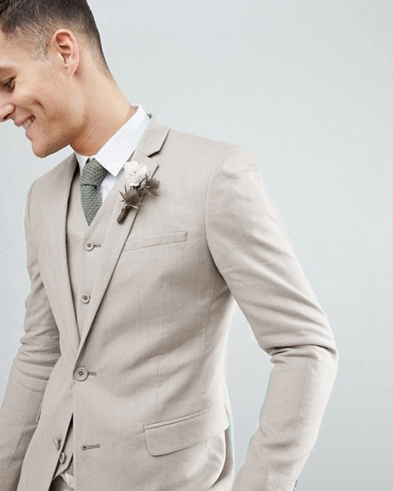 Beige Linen Summer Wedding Suits for Men Casual Beach Groom Outfits 3 Pieces CB27163