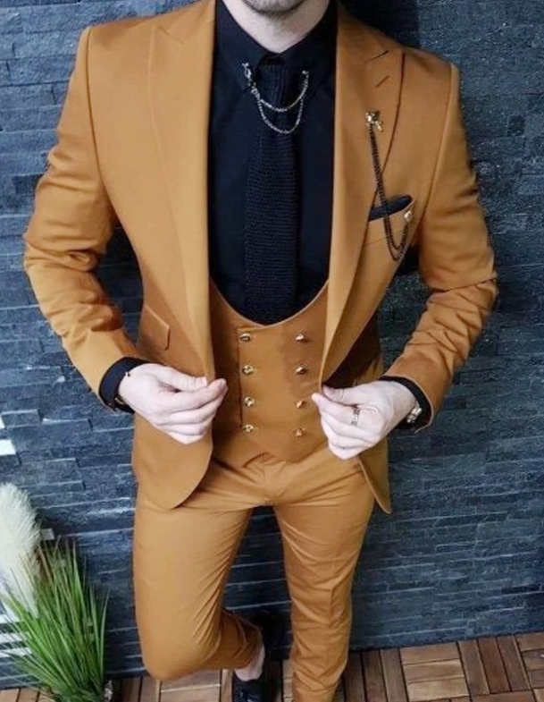 Brown Gold Peak Lapel 3 Pieces Wedding Suits ,Men Formal Dress Prom Suits for Winter/Autum