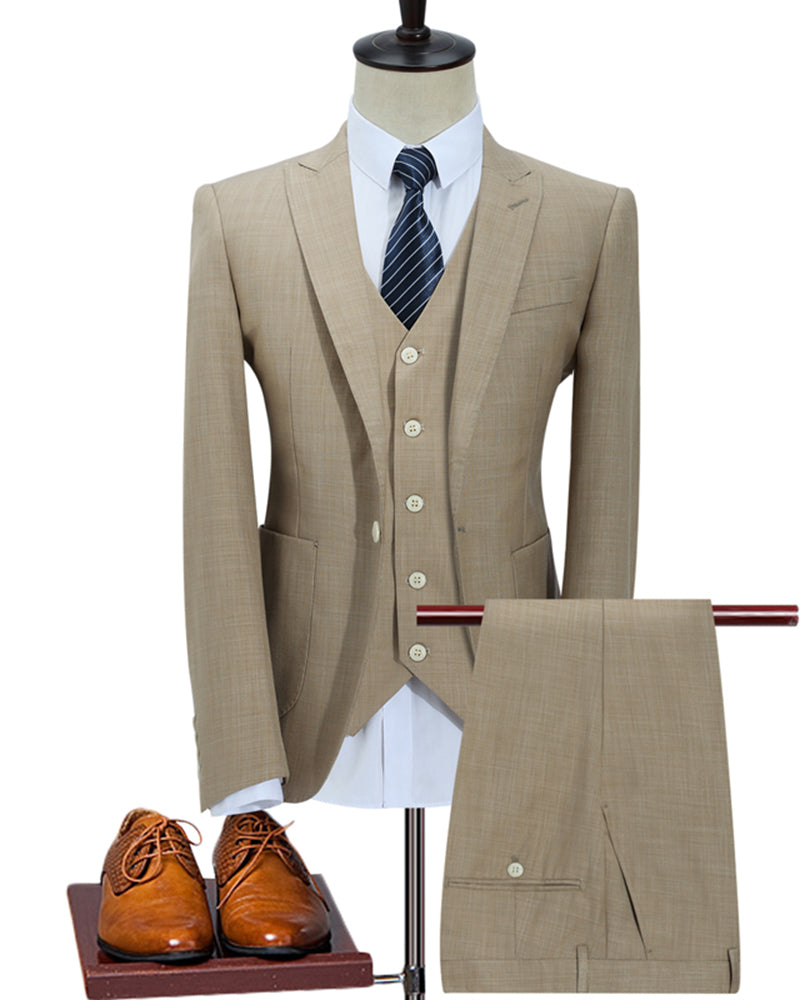 Style Classic Patch Pocket Linen Peak Lapel Khaki Men's 3 Pieces Blazer Suits,Casual Formal Prom Suits for Man CB0817