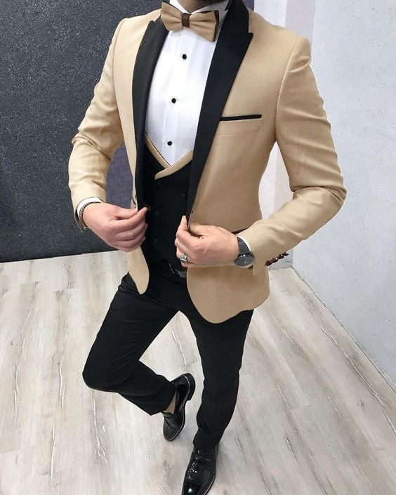 Beige Peak Lapel Slim Fit Gentle men Prom Dress Suits Out fit Groom Wedding Tuxedos 2022 3 Pieces (jakcet+vest+pants)) CB554