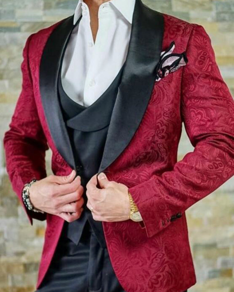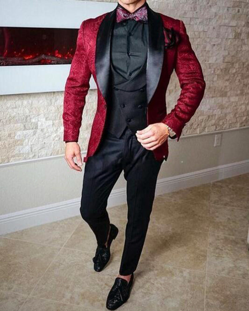 Burgundy Red Wedding Suits for Men Embossing Groom Tuxedos 3 Pieces (Jacket +Pants +vest)