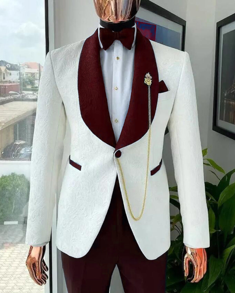 Flroal Ivory Pattern Wedding Tuxedo Suits for Groom 2 Pieces with Burgundy/Navy Trim CB34152