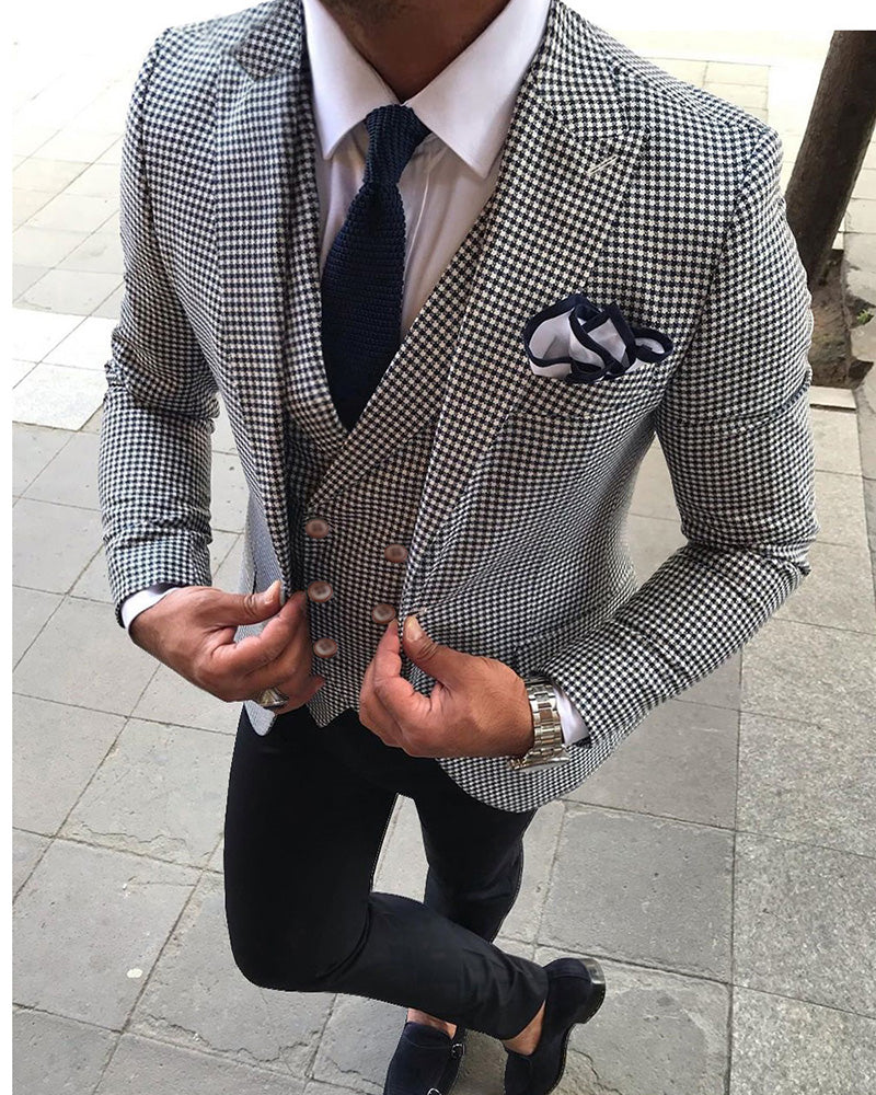 Slim Fit Plaid Dogstooth Blazer Suits for men Peak Lapel Groom houndstooth Wedding Formal Wear (Jacket+vest +pans)PL0430
