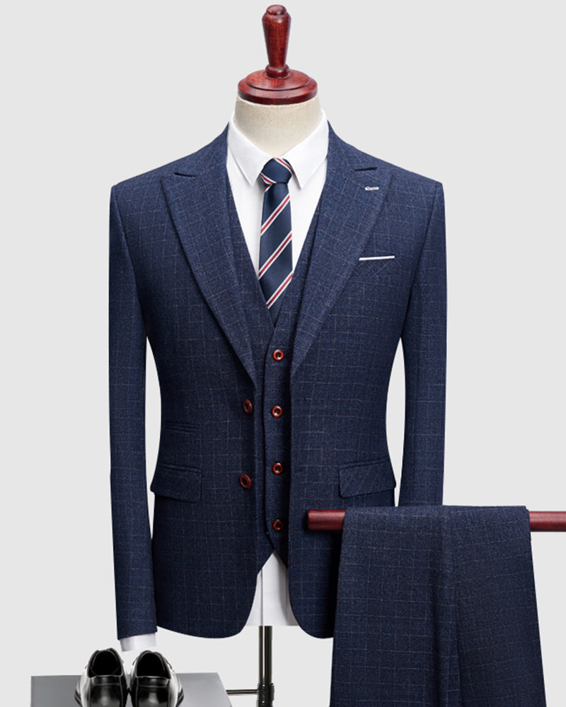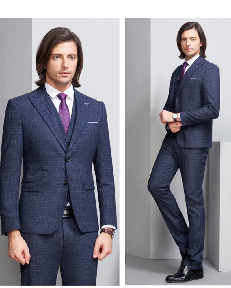 Navy Blue Plaid Men's Business Suit Formal Wear Three Pieces (Jacket+pants+vest)