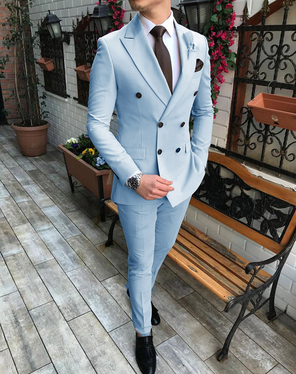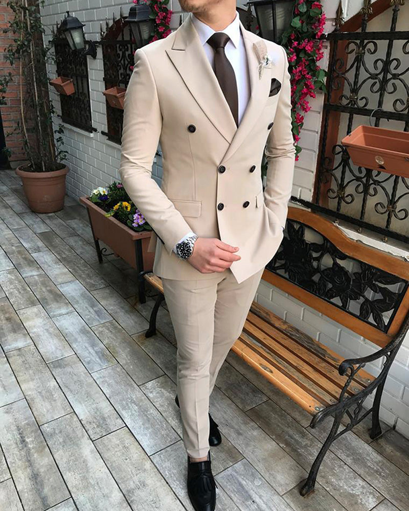 Peak Lapel Beige Double Breast Dinner Jacket Suits for Men 2 Pieces Formal Wedding Party Suits, Blue Prom suits CB0813