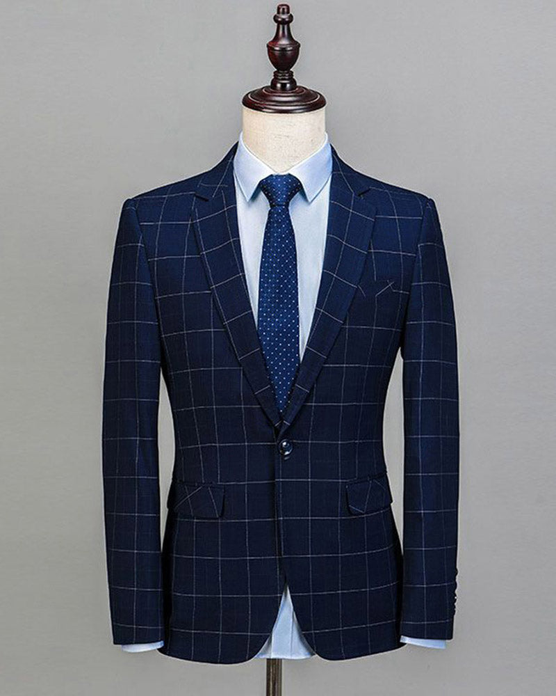 Navy Blue 3 Pieces Mens Suits Plaid Slim Fit Wedding Suits (Jacket+Pants+Vest) CB2432