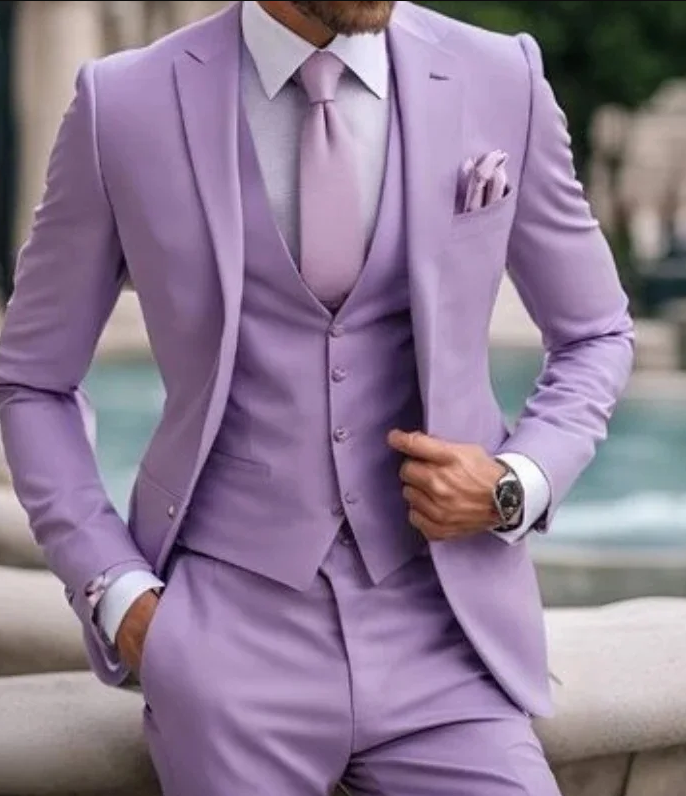 Suits for Men Lilac Stylish 3 Piece Classic Tuxedos Blazer Vest Pants Formal Elegant Male Wedding Groomsman Bespoke