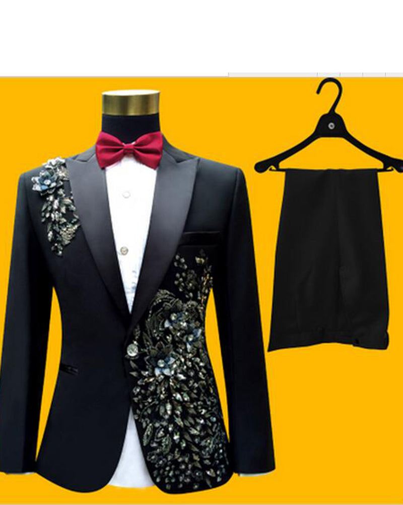 Black Embroidered Prom Dress Suits Stage Singer Costume Homme Mens Suits With Pants