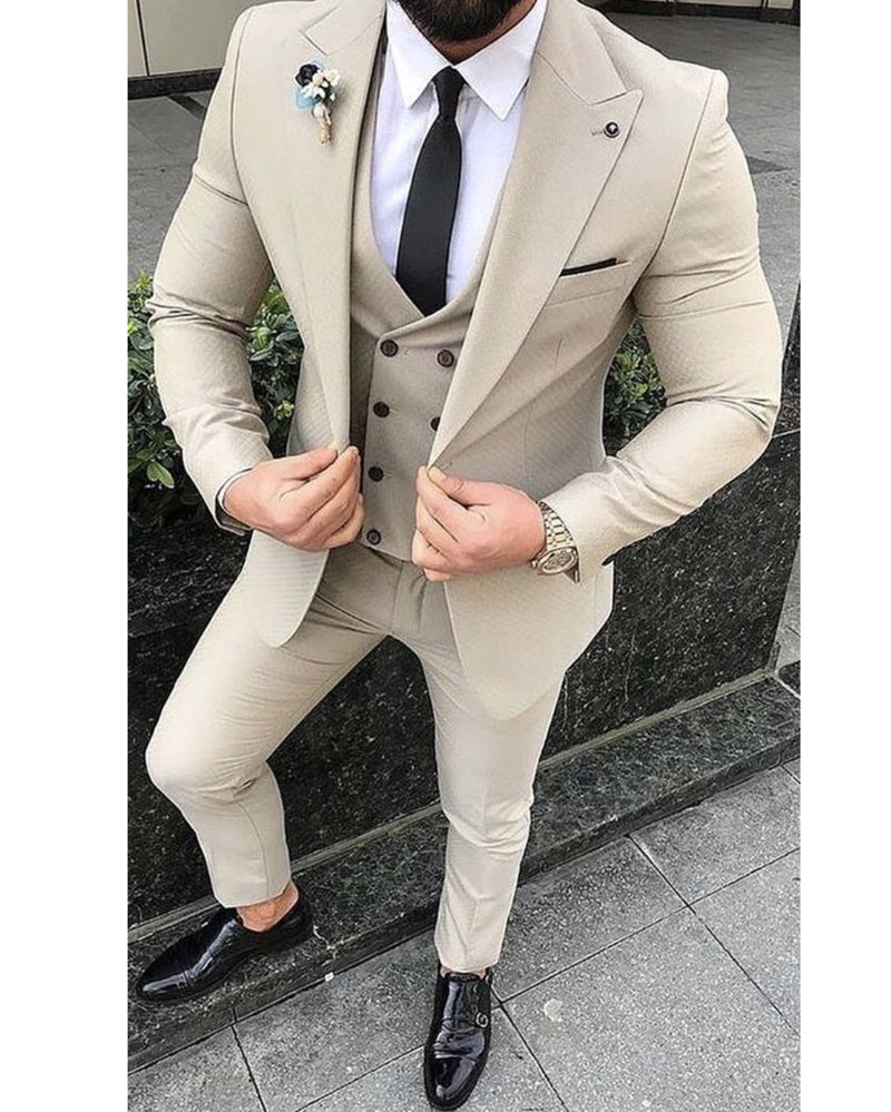 Peak Lapel Beige Wedding Tuxedo Three Pieces Groom Suits CB674