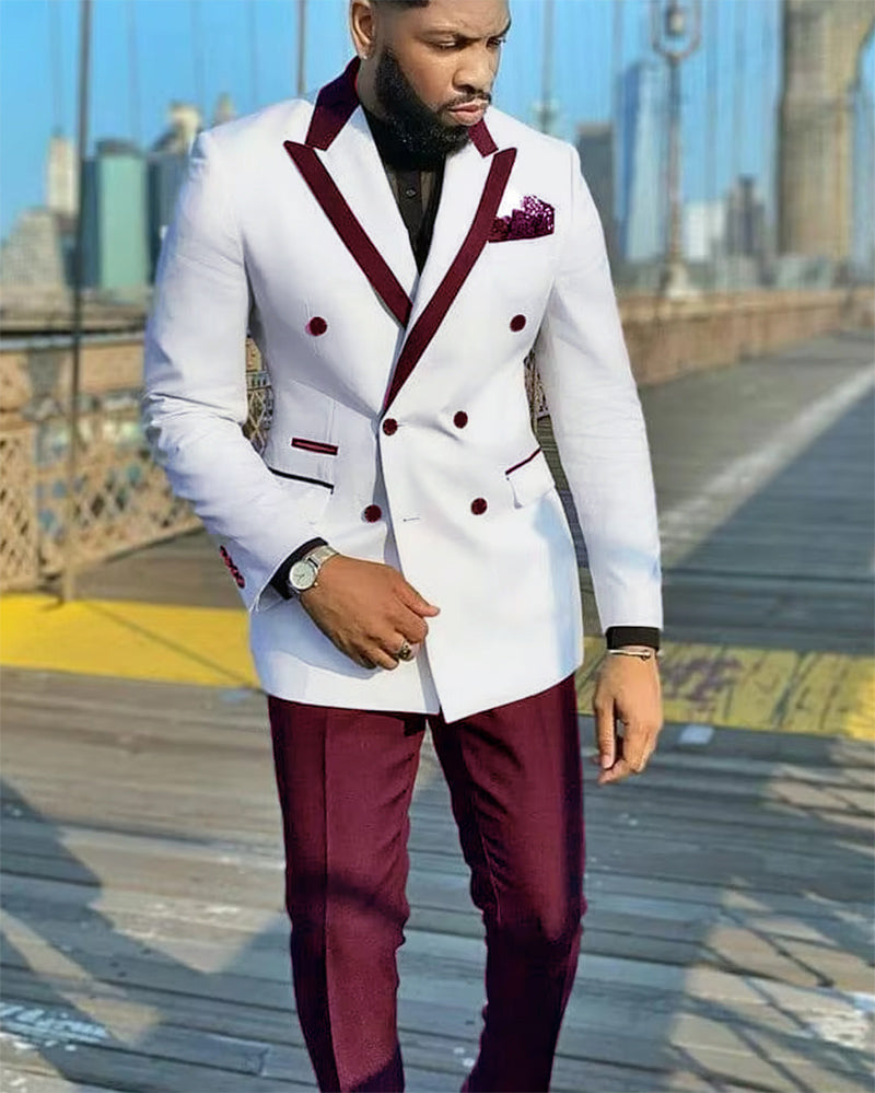 Elevate your wedding day style with this slim fit 2-piece tuxedo in a sophisticated white and burgundy color scheme. The crisp white jacket, paired with rich burgundy trousers, creates a striking contrast perfect for the modern groom. Crafted from premium fabric, this wedding tuxedo offers a tailored silhouette that exudes confidence and refinement. Ideal for formal ceremonies or black-tie events, this ensemble combines timeless charm with contemporary flair. Stand out effortlessly on your special day in this luxurious and stylish tuxedo
