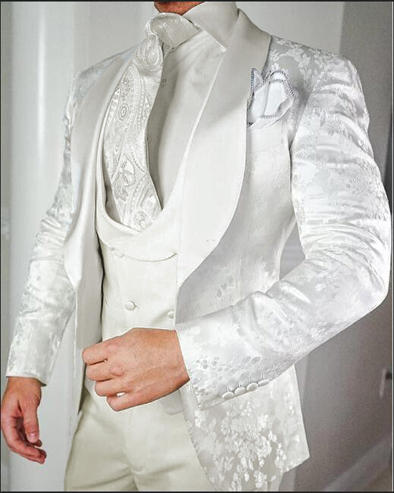 Ivory Floral Pattern Jacquard Wedding Tuxedo for Groom 3 Pieces Slim Fit Men Suits with Satin Shawl Lapel Custom Male Fashion Costume 3 Pieces Jacket Vest CB2226