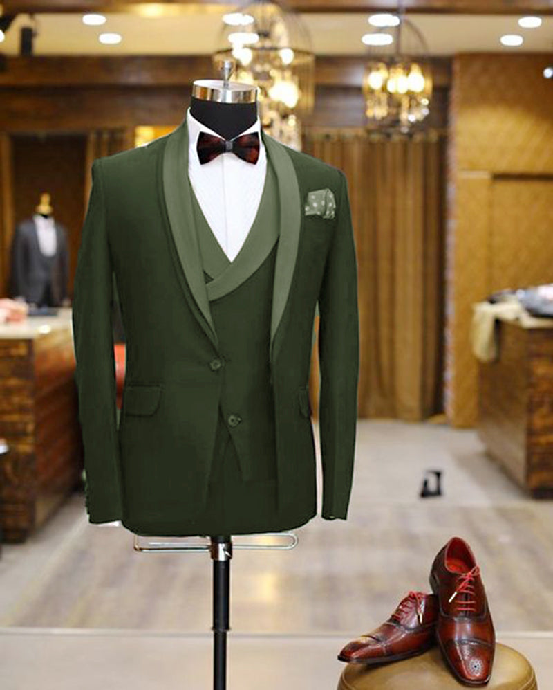 CB2111 Traje de fiesta de 3 piezas con solapa tipo chal verde oliva a la moda para hombre