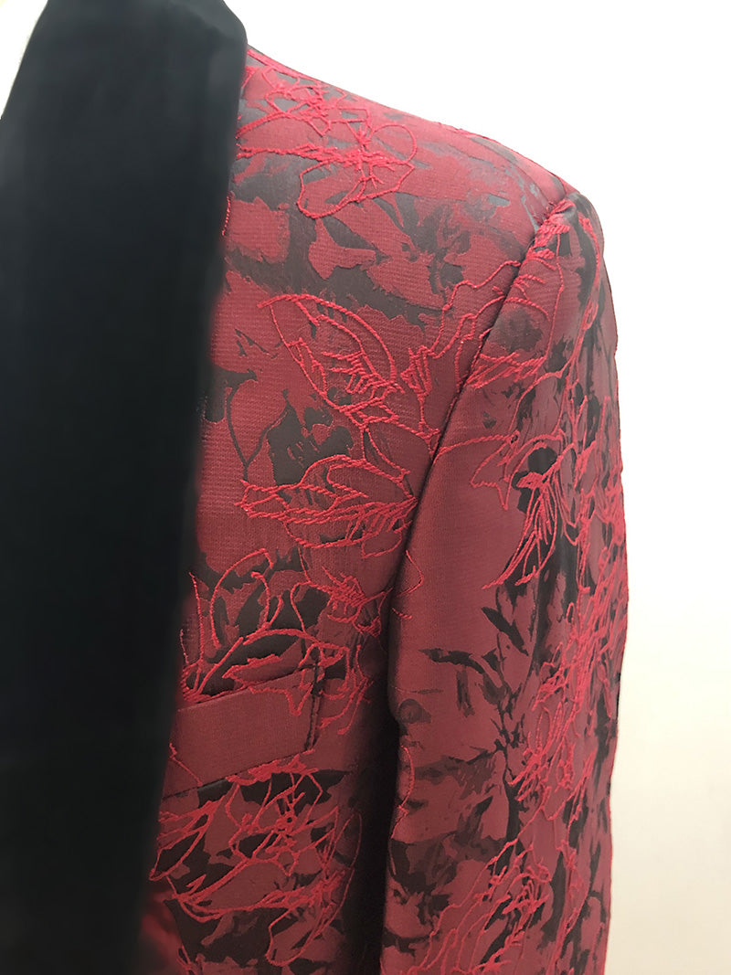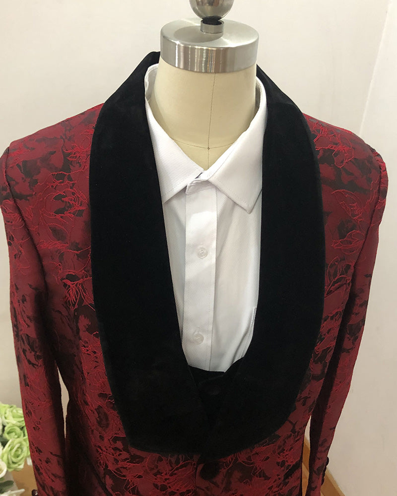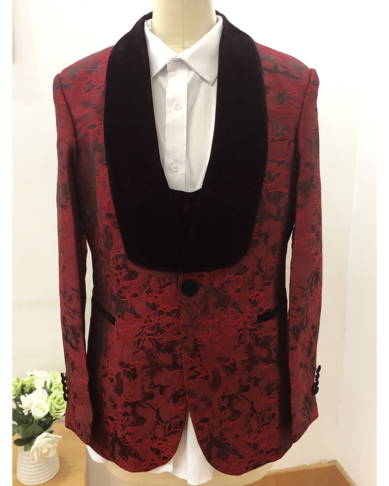 Trajes de fiesta de jacquard burdeos/negro de Classyby, esmóquines de boda para padrinos de boda 2020 CB6666 3 piezas (chaqueta + pantalón + chaleco)