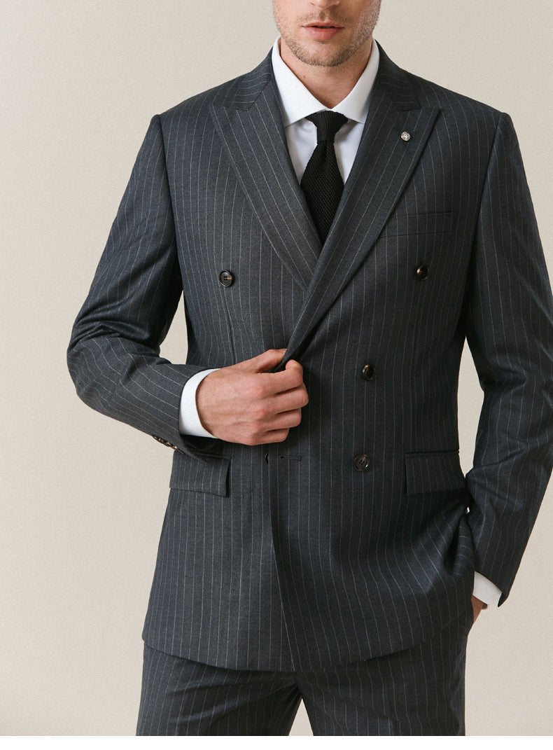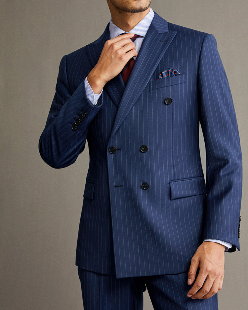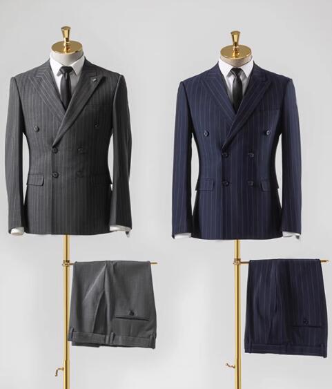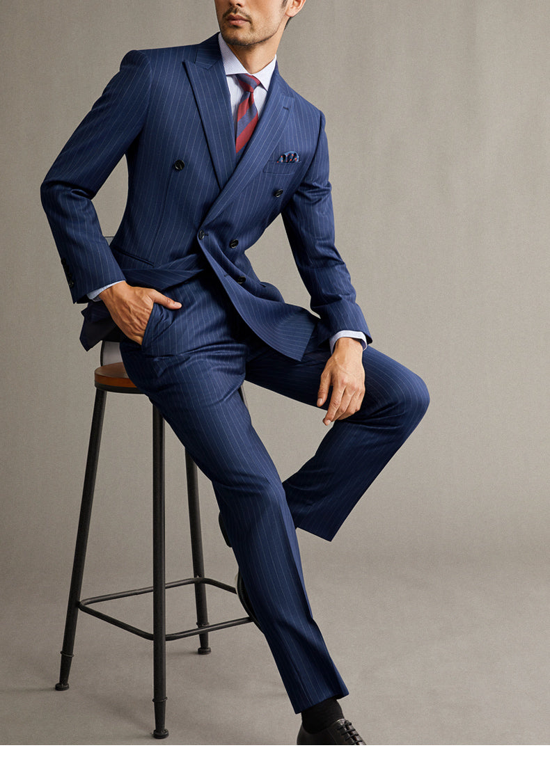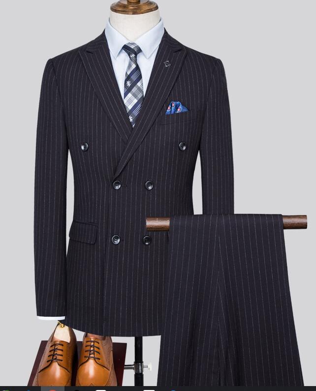 Traje de boda de dos piezas con doble botonadura y rayas azul marino a medida (chaqueta + pantalón) CB11223