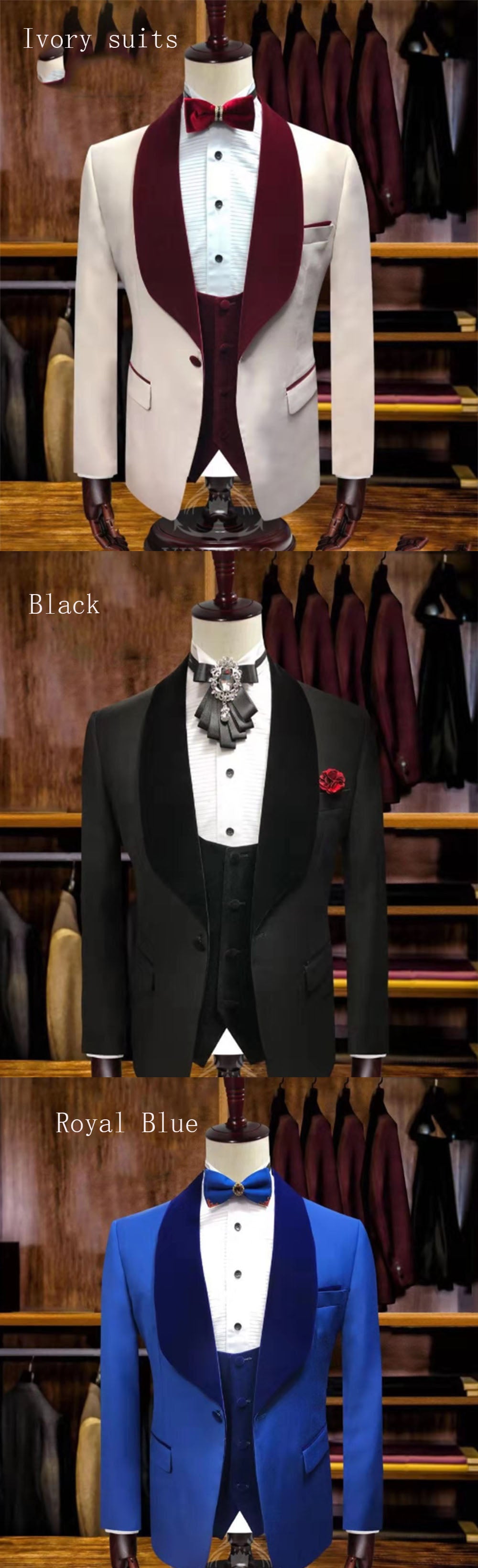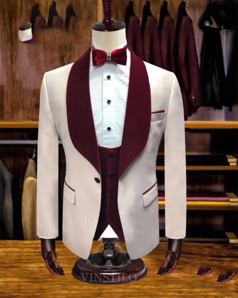Fantásticos trajes de boda con solapa de terciopelo burdeos marfil para hombre 2021 3 piezas (chaqueta + pantalón + chaleco) CB10919