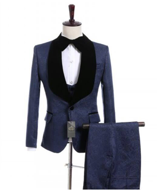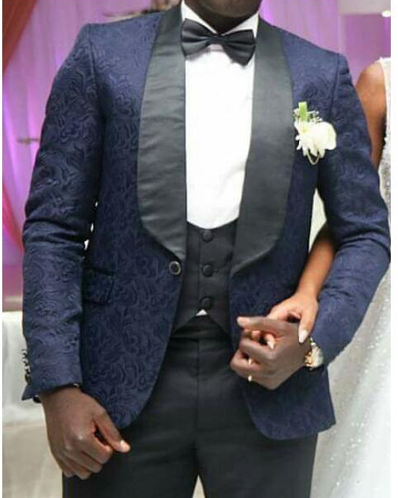 Últimos trajes para hombre, esmoquin de boda en jacquard azul marino para novio, 3 piezas (chaqueta, abrigo, chaleco y pantalones)