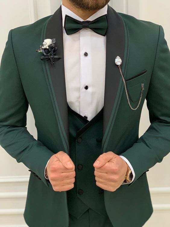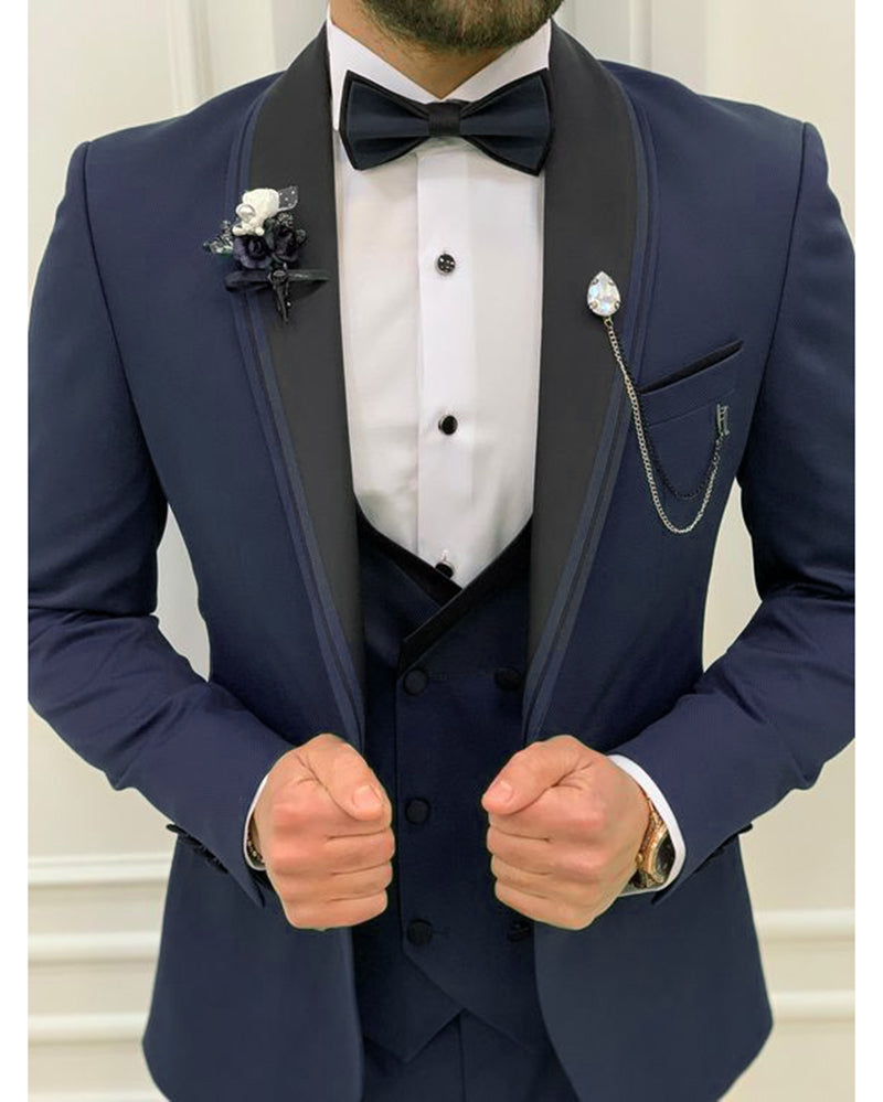 Esmoquin de novio para boda azul marino de 3 piezas, chaqueta con chal negro, chaleco y pantalones CB47676