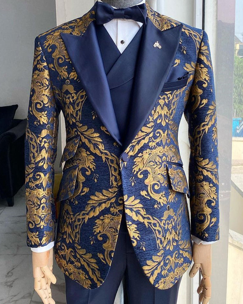 Esmoquin con estampado floral en jacquard azul marino y dorado con solapa de pico para caballero, chaqueta de esmoquin con chaleco y pantalón, traje masculino de 3 piezas CB47099