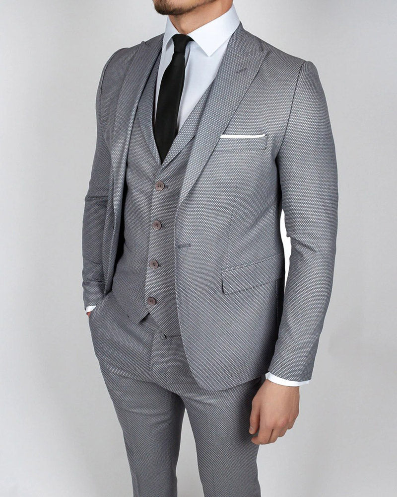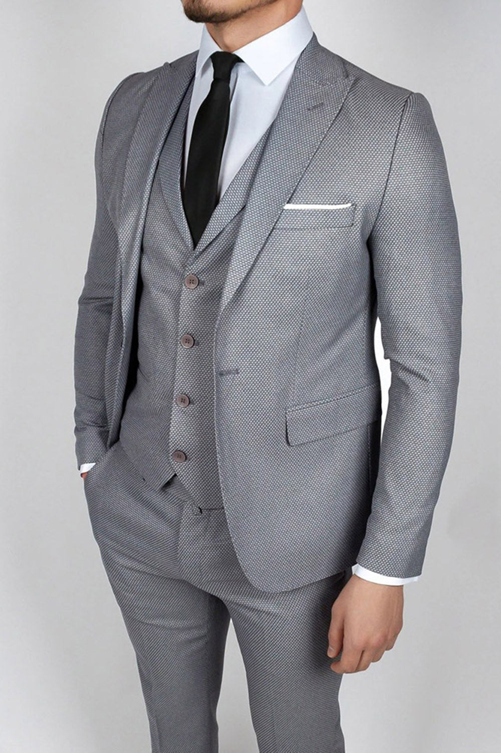 Trajes de 3 piezas de lana gris, ajustados y elegantes, con solapa de pico, hechos a medida, para hombre, trajes formales de vestir 2021 (chaqueta + chaleco + pantalones) CB11015