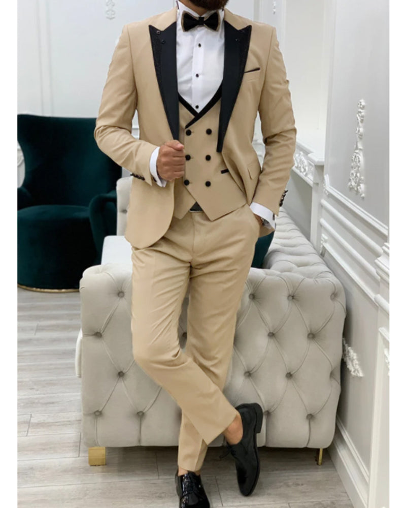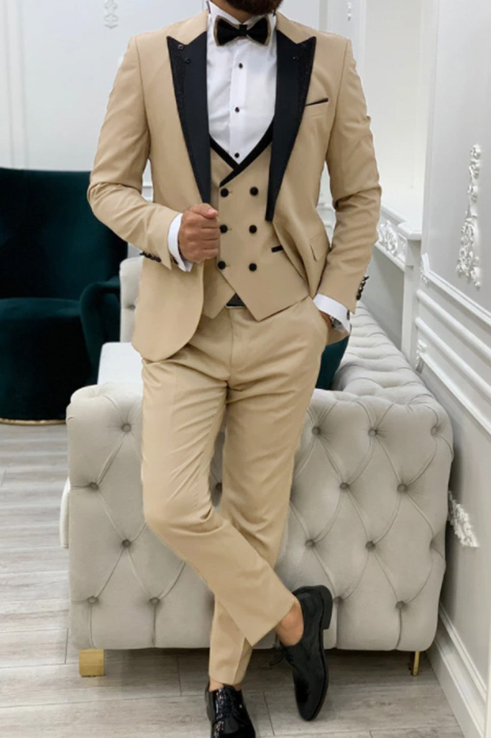 Trajes de novio de boda en color beige/champán con solapa de pico y satén negro a medida, esmóquines 2022 de tres piezas (chaqueta + chaleco + pantalones) CB1116