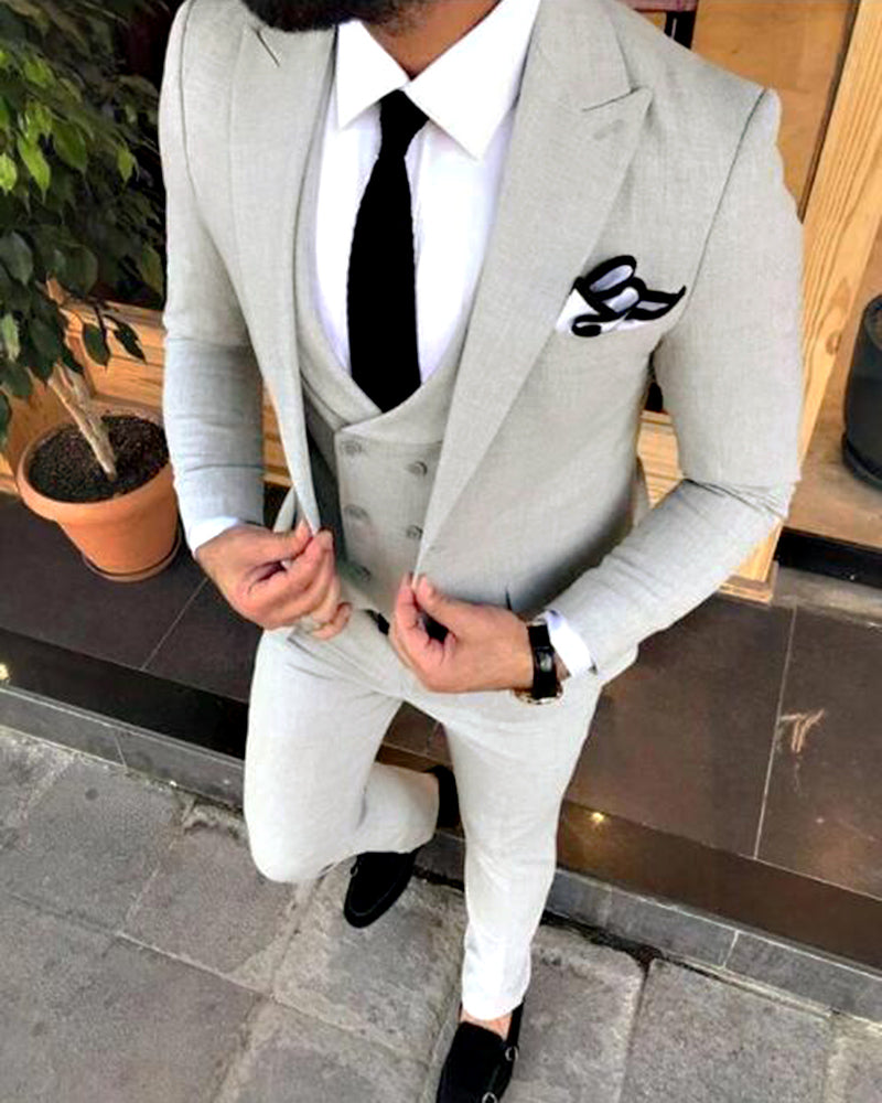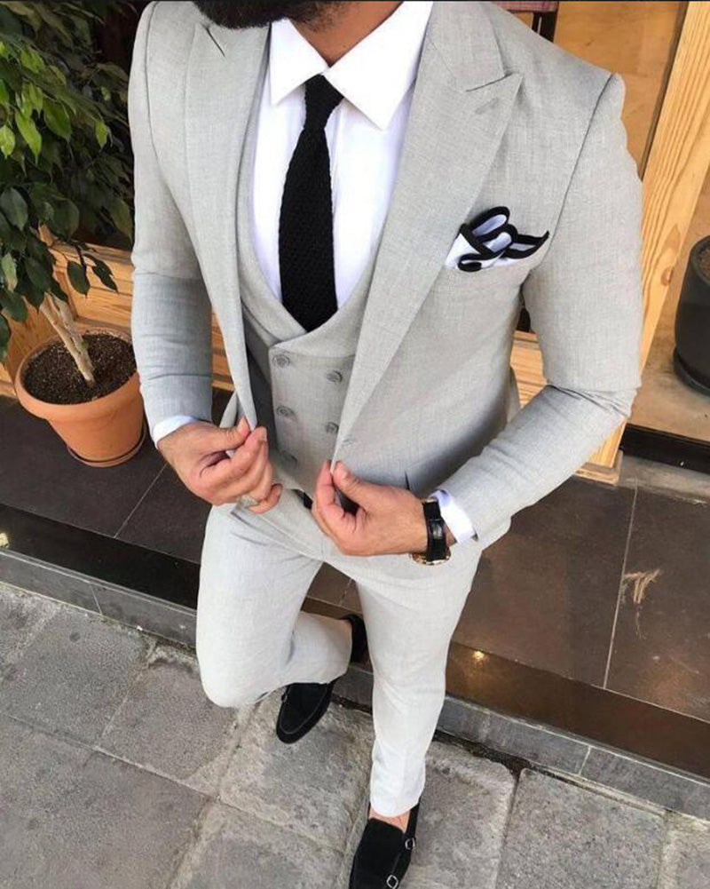 Traje formal de 3 piezas para hombre, de color gris claro, ajustado, para verano, para graduación, esmoquin (chaqueta, chaleco y pantalones) CB0519