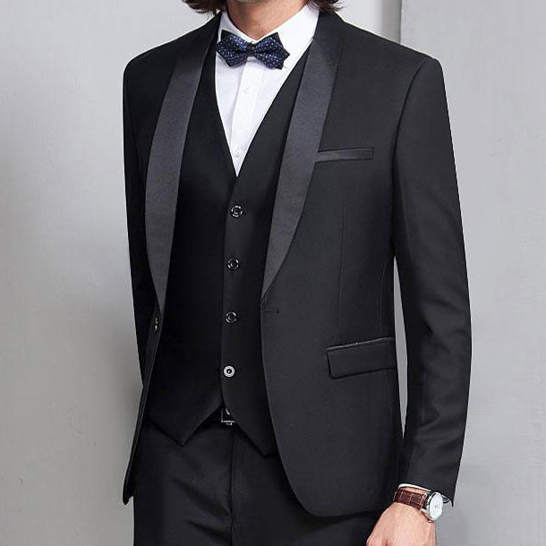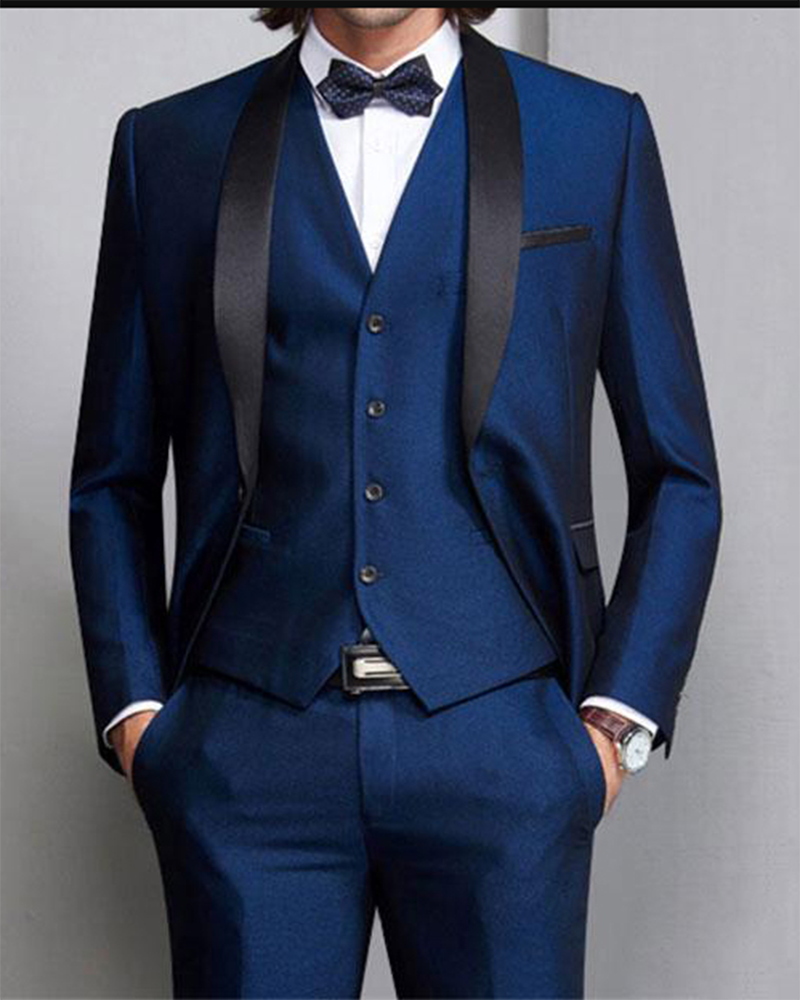 Trajes de hombre azul marino para boda, blazer, solapa chal negra, esmoquin ajustado para novio, 3 piezas, últimos diseños de abrigo y pantalón, disfraz CB10718