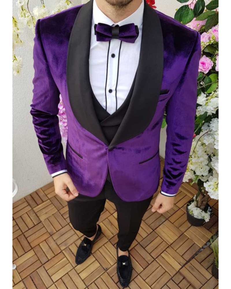 Traje de esmoquin de terciopelo con solapa chal y color morado y negro para hombre, traje formal de boda, ropa para hombre CB10153