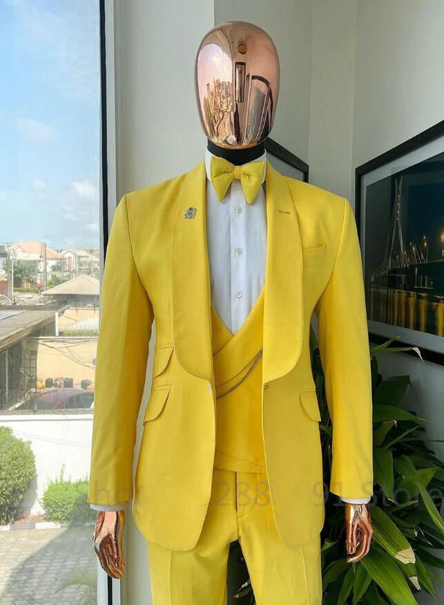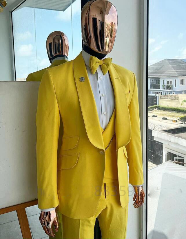 Traje de moda para hombre, corte entallado, solapa chal amarilla, elegante, formal, 3 piezas, esmoquin de boda para padrino de boda (blazer + chaleco + pantalones), disfraz para hombre
