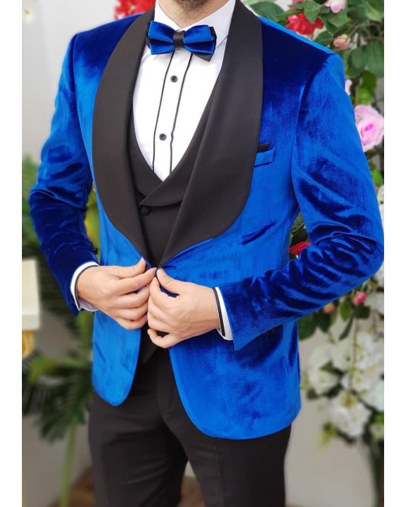 Chaqueta de esmoquin de terciopelo azul real con chal de satén para hombre, trajes de esmoquin de 3 piezas anzug herren CB10192
