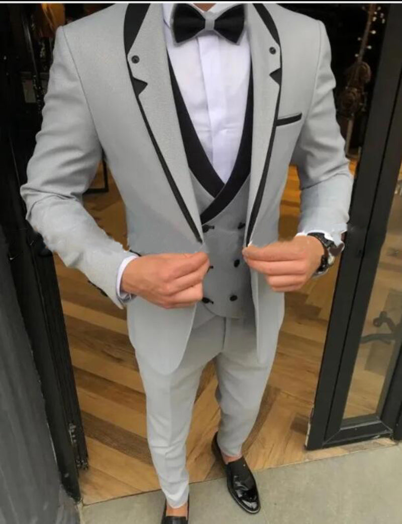 Esmoquin gris claro de corte entallado con solapa negra para hombre, trajes de boda CS4710