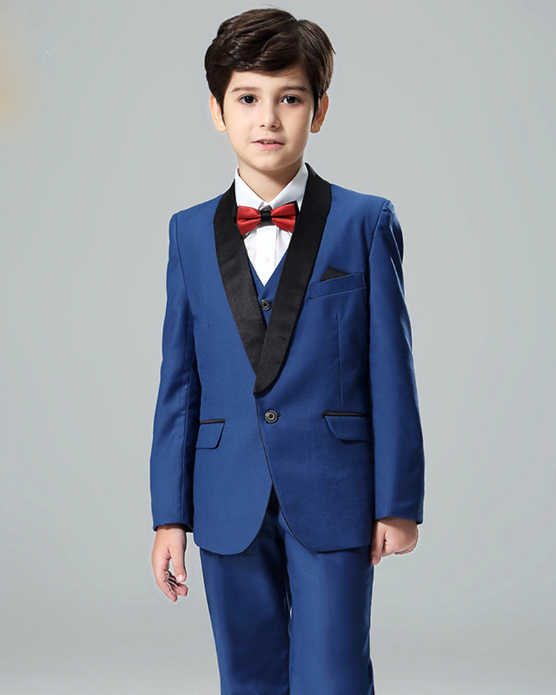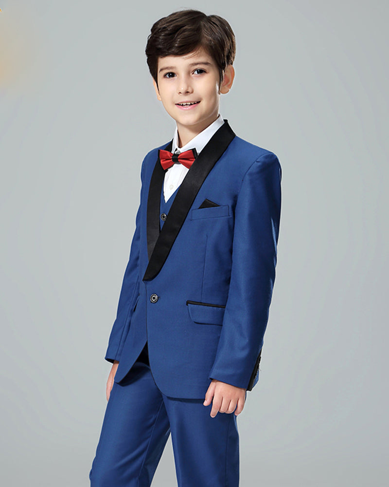 Traje de boda para niño pequeño azul/negro con solapa chal (chaqueta + chaleco + pantalones)