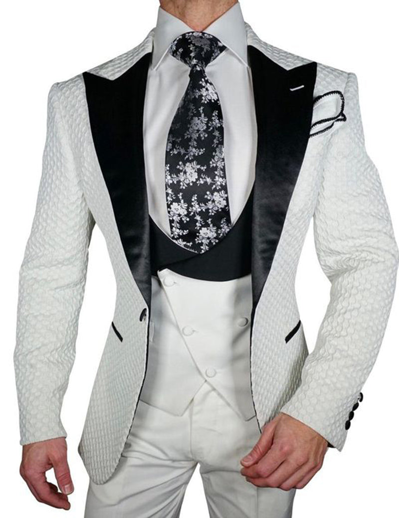 Esmoquin de novio para boda con solapa de pico y diseño blanco para hombre, 3 piezas, con solapa negra