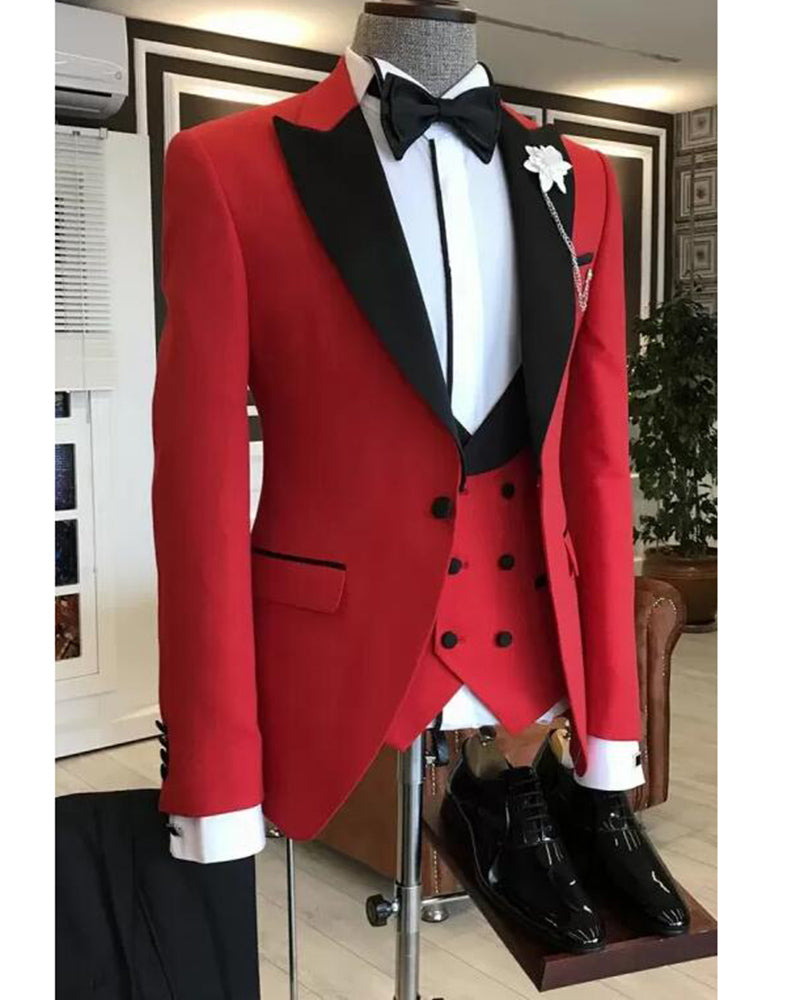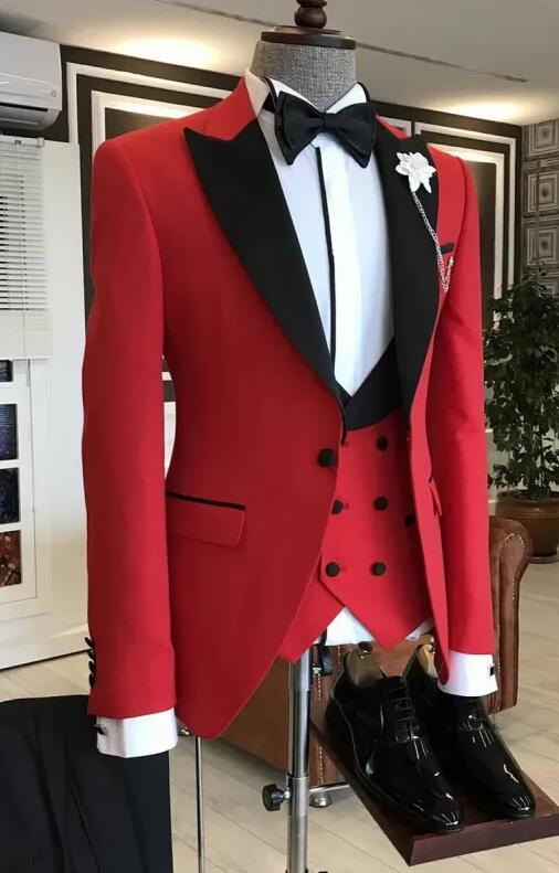 Trajes de esmoquin de graduación para hombre rojos 2024 con solapa de pico negra, 3 piezas, chaqueta + chaleco + pantalones CB3927