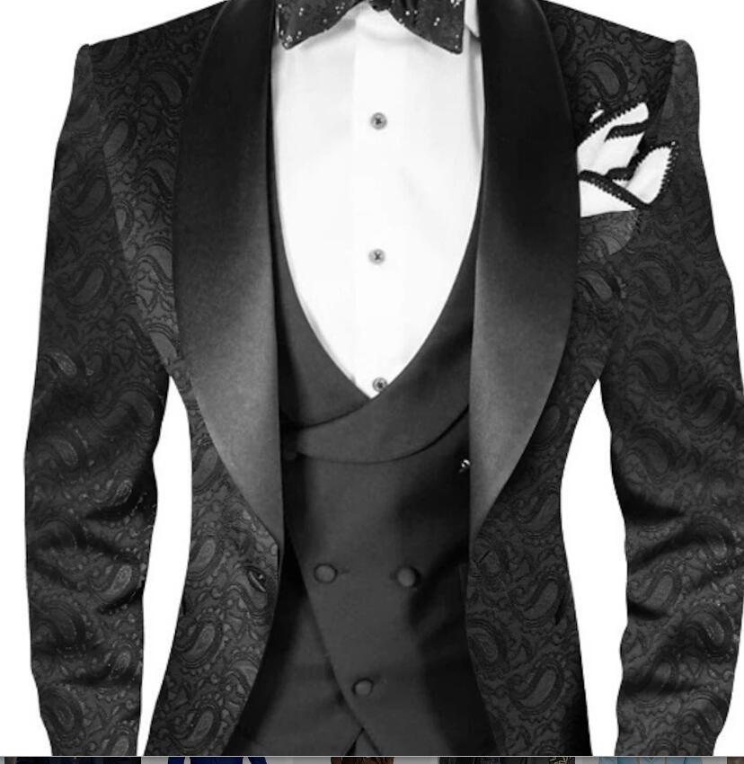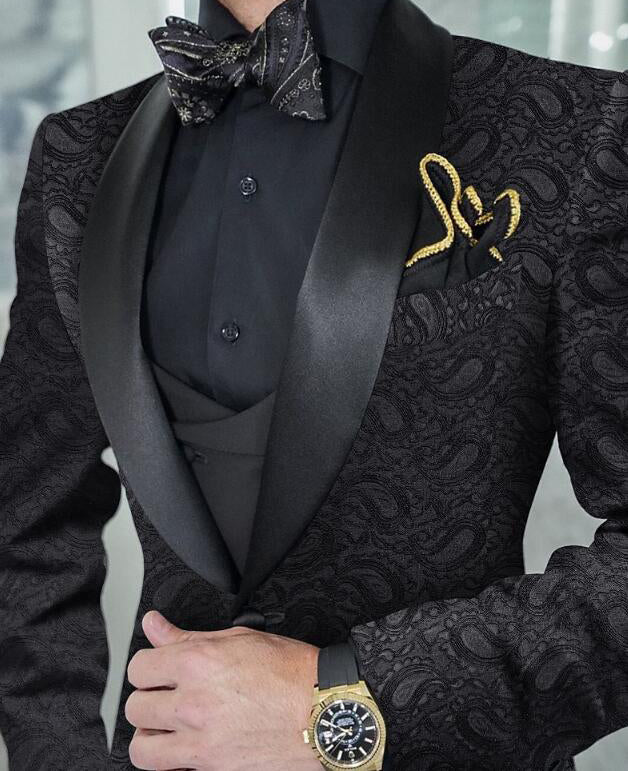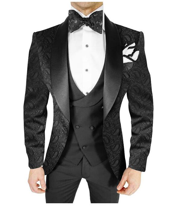 Esmoquin de boda de 3 piezas con solapa chal y diseño de cachemira en jacquard negro CS2414