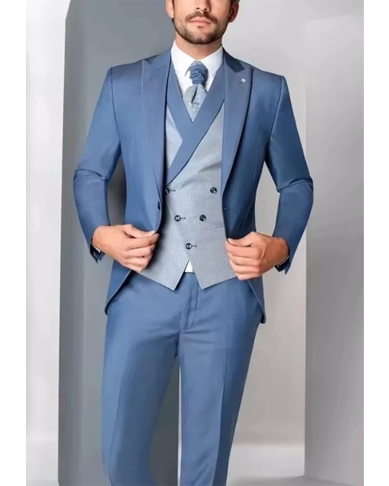 Traje de esmoquin de boda azul de corte entallado para hombre, 3 piezas, chaqueta + pantalón + chaleco CS1023