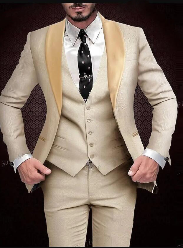 Esmoquin con estampado de cachemira dorado y corte entallado para hombre, 3 piezas CS45223