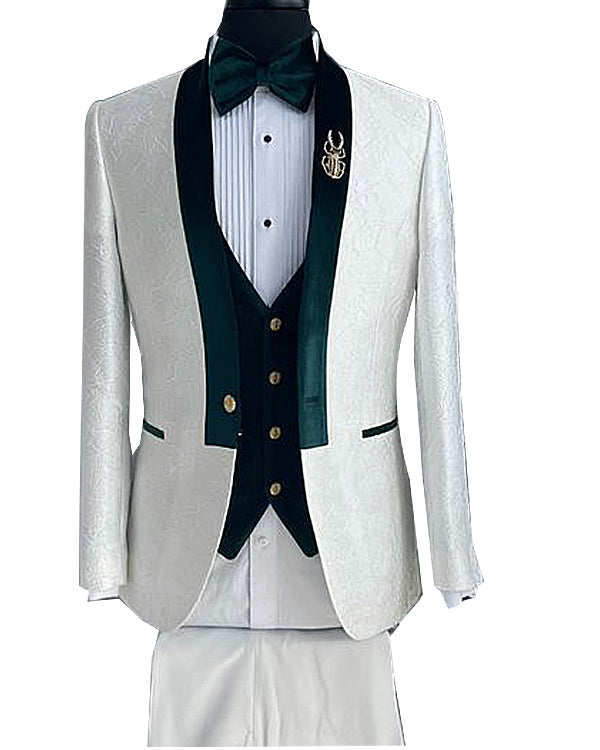 Chaqueta y pantalones de esmoquin para novios en marfil con estampado de cachemira y solapas de terciopelo CB1227