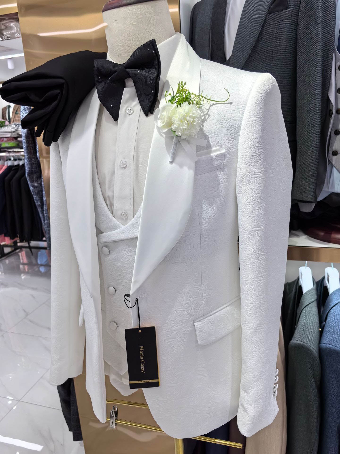 Color.Esmoquin blanco con pantalón negro.