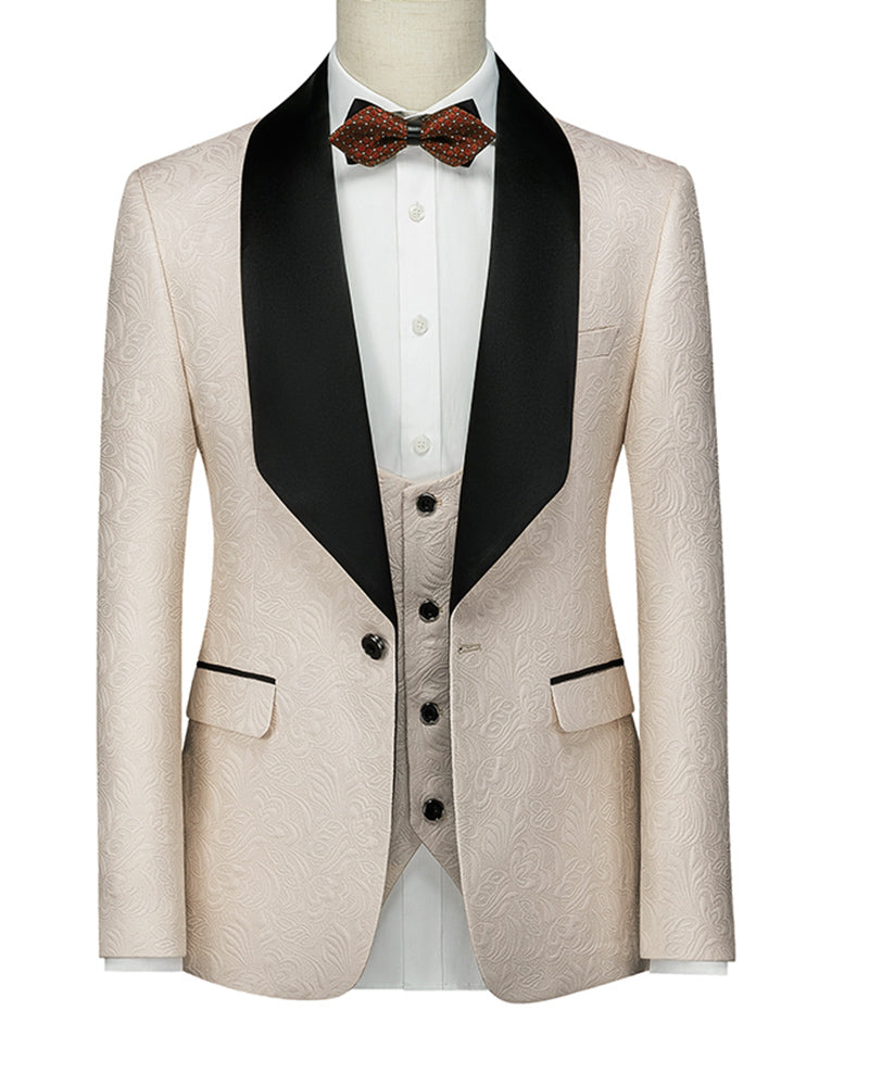 Traje de 3 piezas de esmoquin para padrinos de boda con solapa de satén y chal beige para hombre (chaqueta, pantalón y chaleco) CB10210