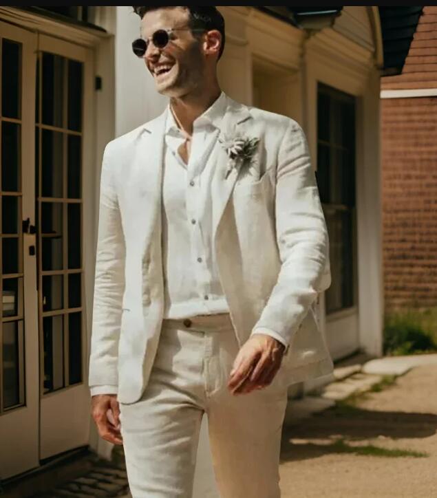 Trajes de boda de lino para hombre color marfil para verano, 2 piezas, chaqueta + pantalón CS4810