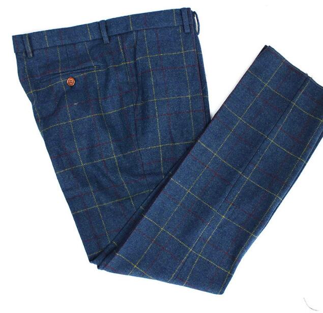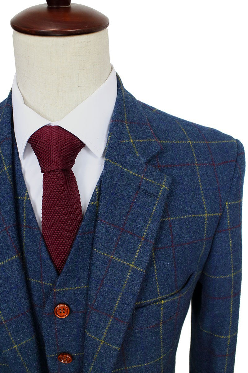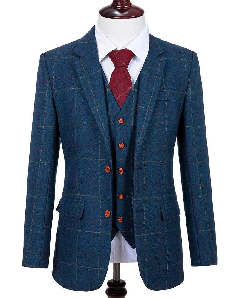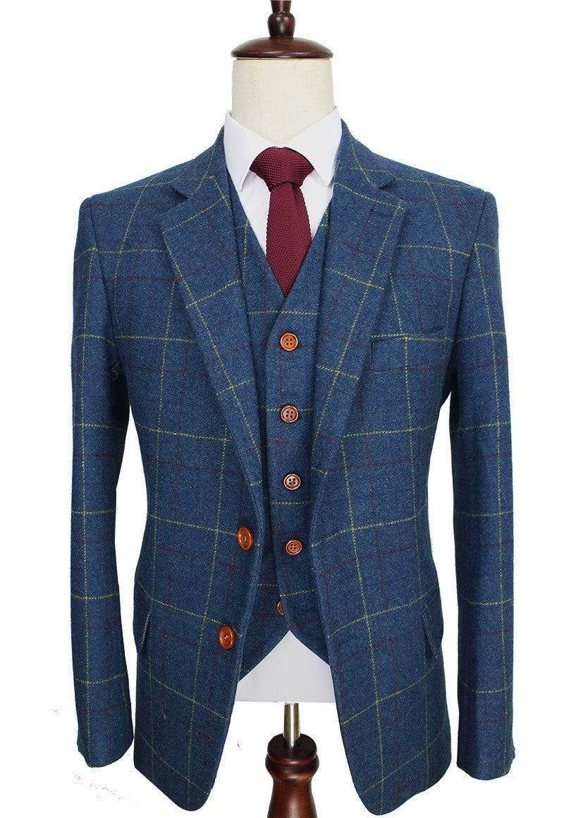 Costume 3 pièces sur mesure en laine bleu marine à carreaux en tweed pour hommes Blazers Costumes de mariage rétro pour hommes (veste + pantalon + gilet)) CB0827