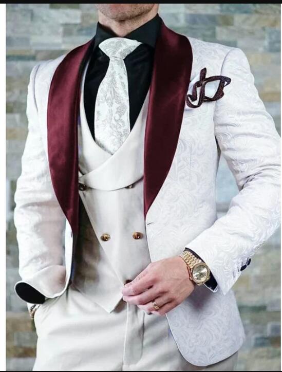 Costume de smoking de mariage 3 pièces à revers bordeaux et motif floral blanc CB3326