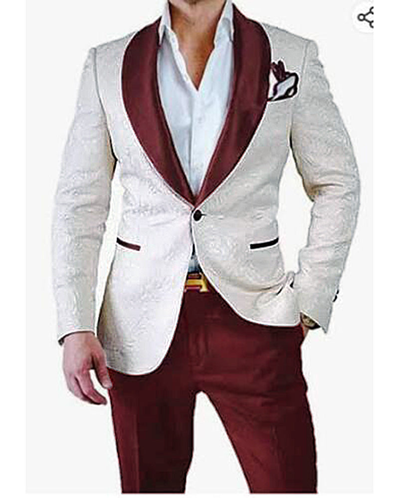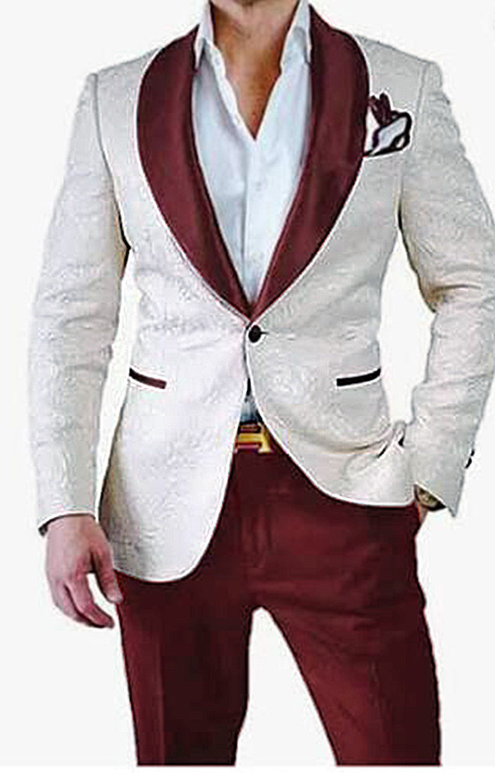 Smoking de marié à motif cachemire bordeaux ivoire pour homme veste de dîner + pantalon CB2371