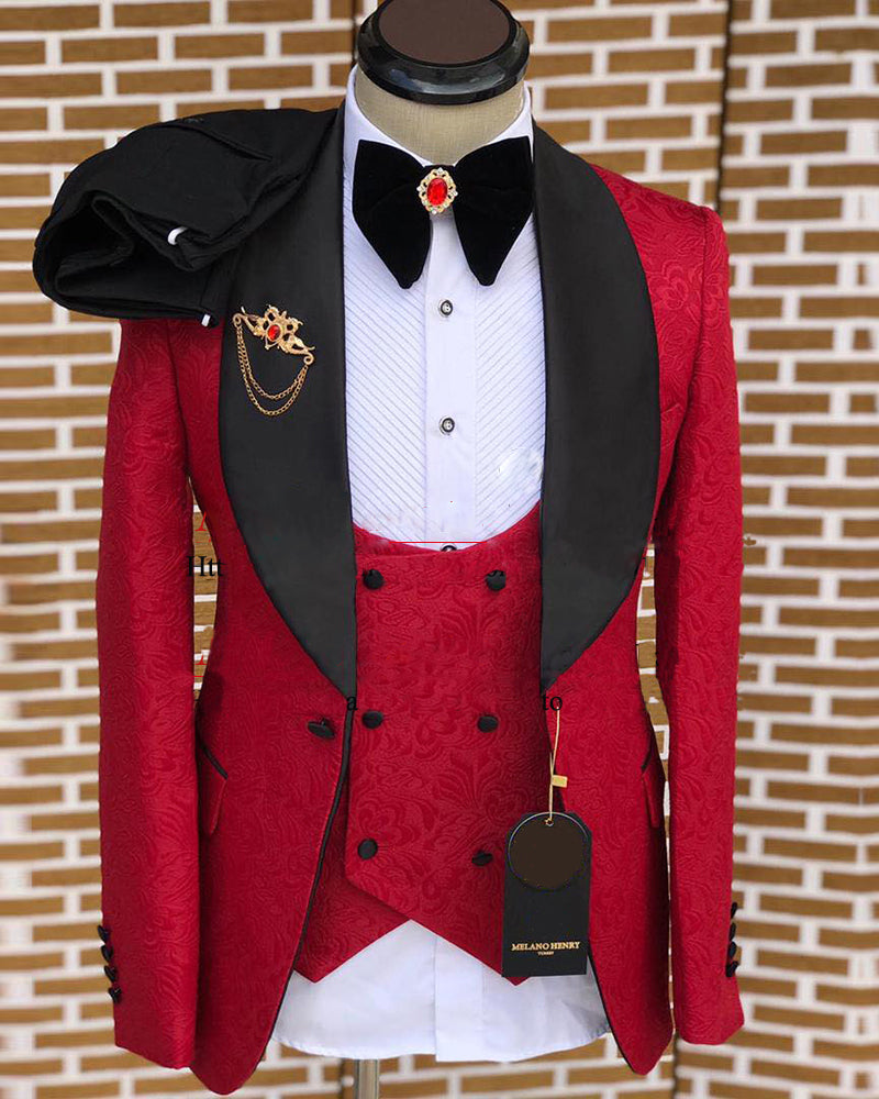 Smoking de mariage 3 pièces pour homme à motif floral cachemire noir et rouge CB3515
