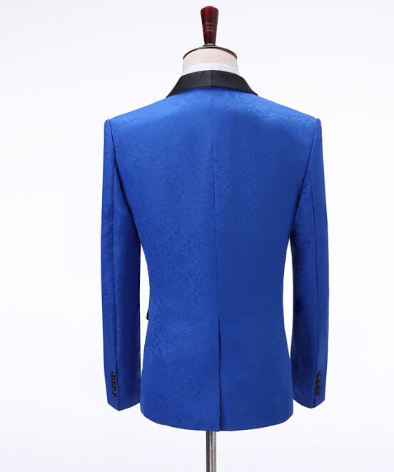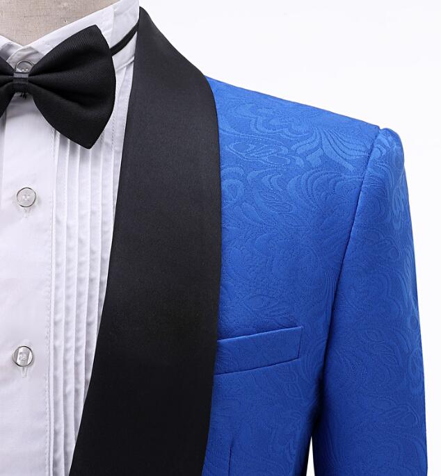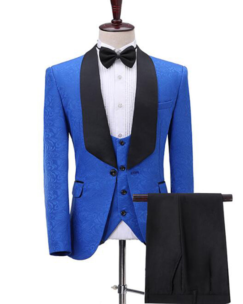 Smoking de mariage bleu royal, costume de marié noir à revers châle, vêtements pour hommes 3 pièces (veste + pantalon + gilet)