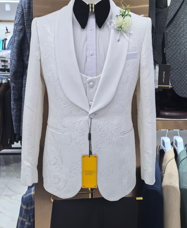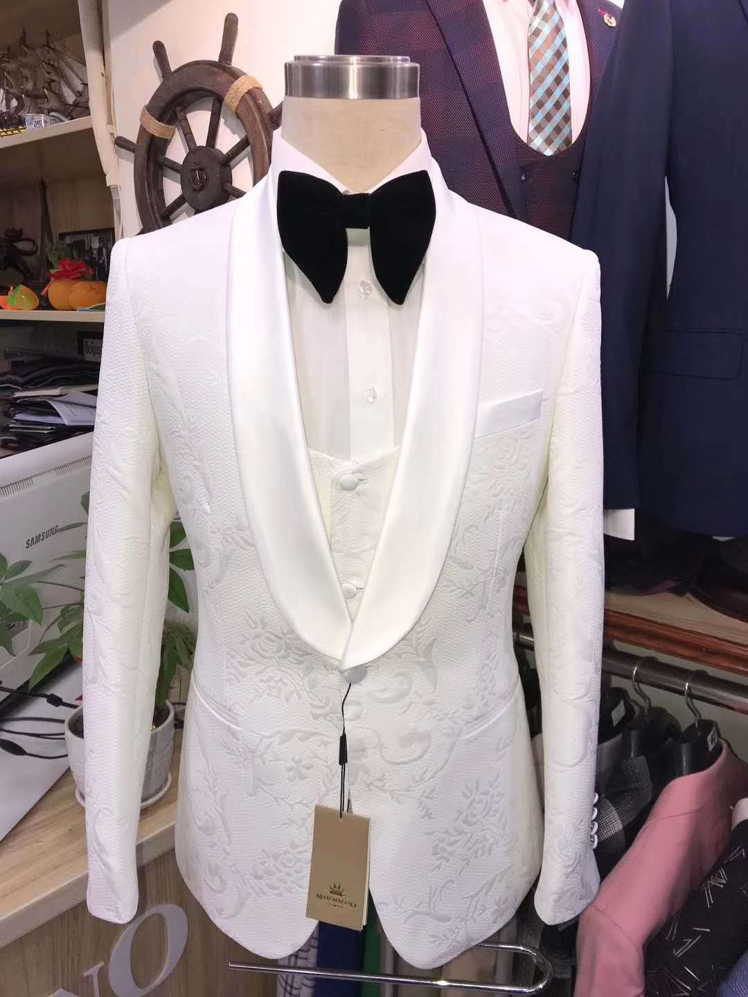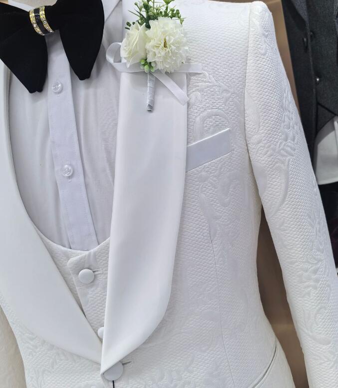 Costumes de mariage ivoire en jacquard à revers châle, pantalon noir, smoking pour homme, 3 pièces (veste + pantalon noir + gilet) CB09082